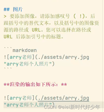 []表示图片加载不出来的时代替的文本,()里面写图片的路径或者url,“”写对图片的描述。