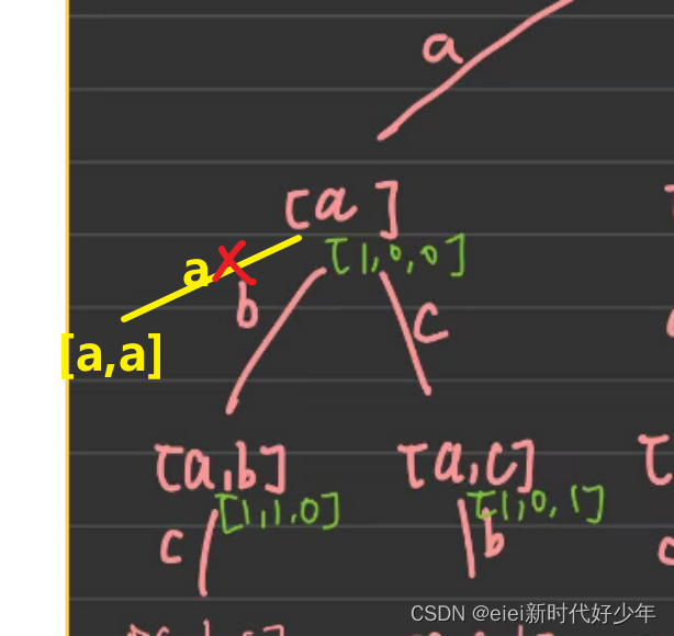 在这个图中我们可以发现,选完a之后,在选a这条路是被剪掉的,我们剪掉的条件就是,当used数组它所对应的位置是1的时候,我们就跳过不取,这样就成功去重了。