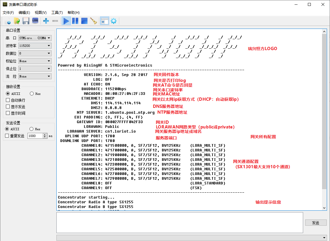在网关配置服务器ip和端口: AT+PKTFWD=address,port_up,port_down