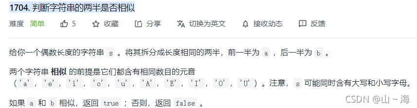 该代码片段展示了一个C++类Solution中的成员函数,该函数用于检查字符串的前半部分和后半部分元音字母(包括大小写)的数量是否相等。通过遍历字符串并对比元音计数,函数返回一个布尔值表示两半部分的元音数量是否相同。