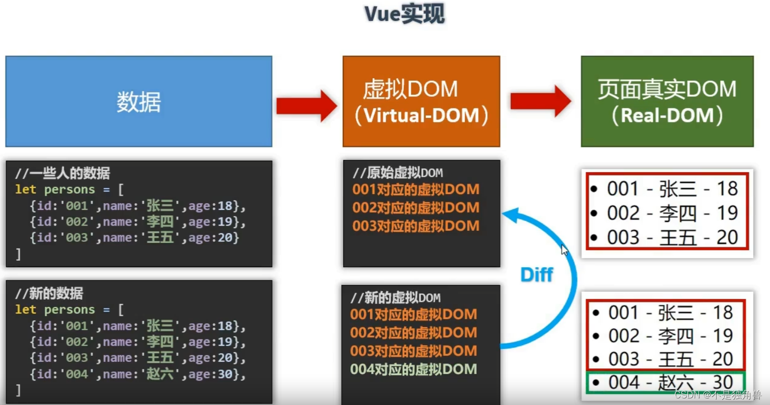 Vue在添加新数据时,如果之前有旧的虚拟DOM,它会将新的虚拟DOM与旧的虚拟DOM进行比较(这个过程,就是diff比较,里面有优秀的diff算法) ,原有DOM节点就会复用.