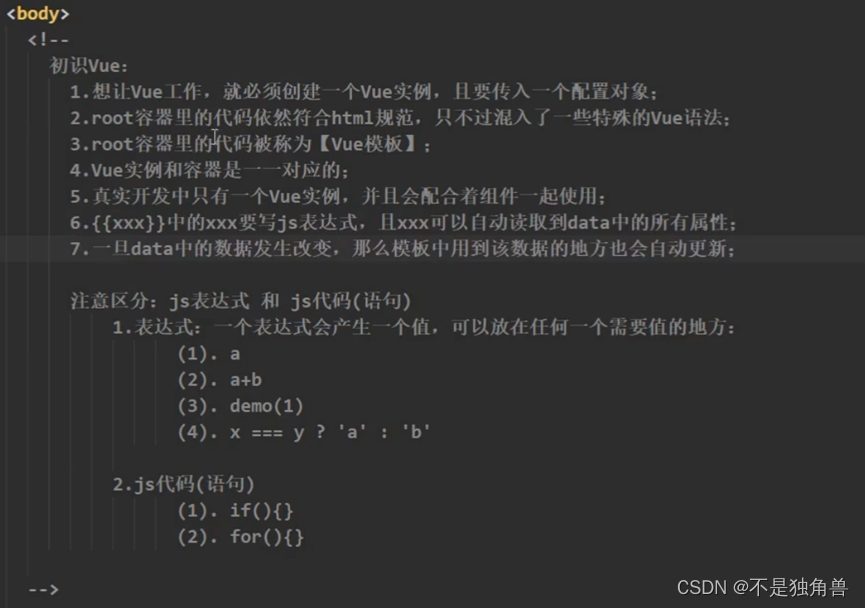 - {{}}里面必须写成JS表达式,不局限于Vue实例配置对象中的Key Value.