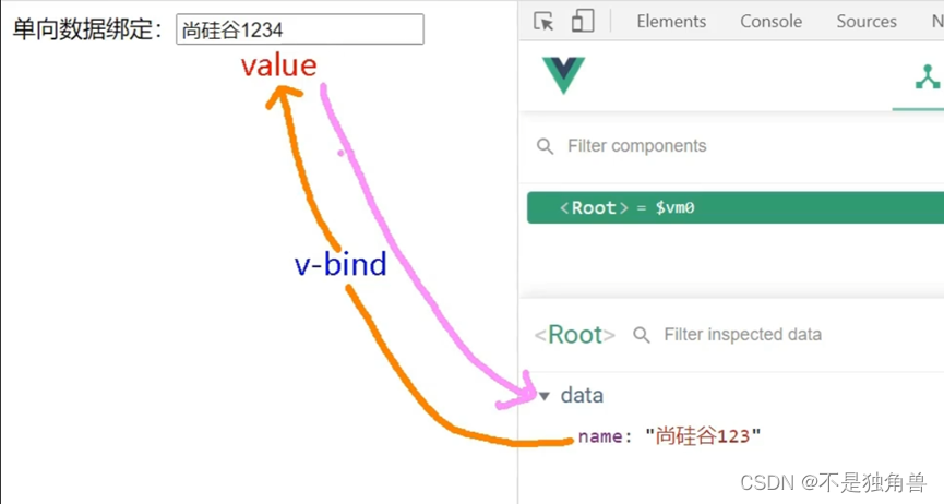 data中数据一变,通过v-bind绑定,输入框的value值就发生变化.(橙色)
