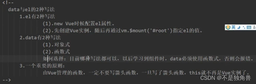 到组件部分后,data的写法强制为函数式,不然会报错.el的写法没有要求.