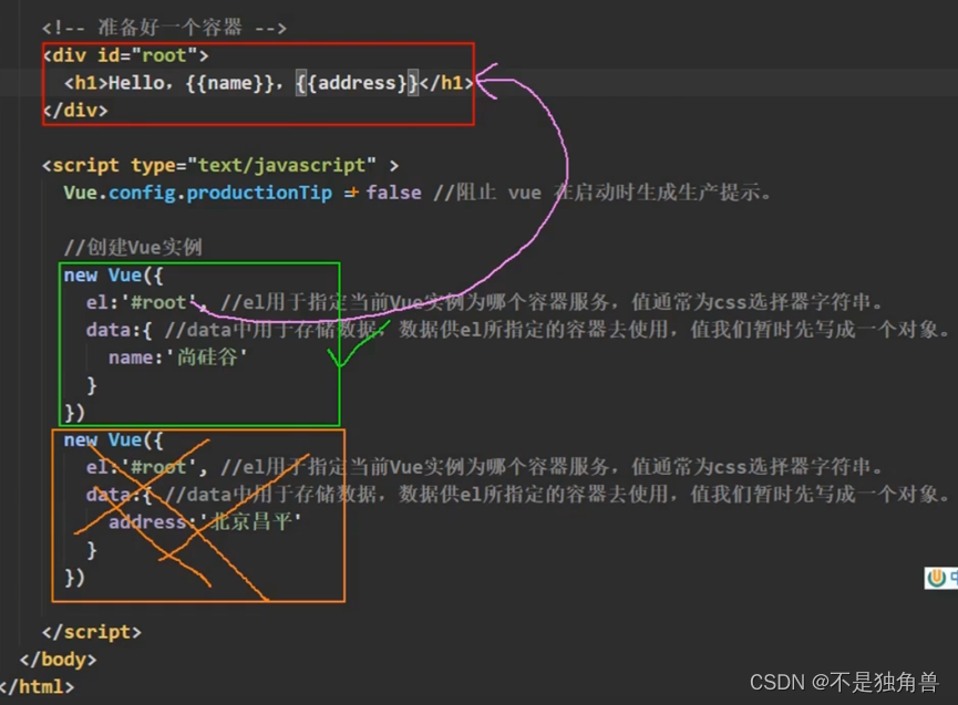 - 红色容器被绿色Vue实例接管,橙色Vue实例虽然被执行,但没有作用,