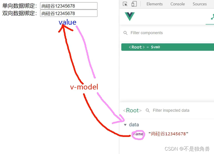 页面输入框的value值改变了,不能回头再影响data中的数据.(粉色)