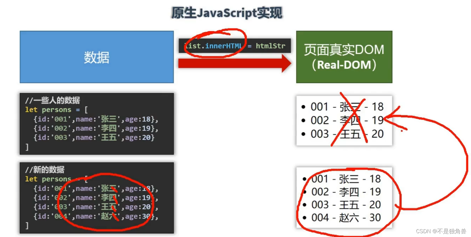原生JS添加新的数据时,会将原有数据替换掉,数据量大,效率会极低 .