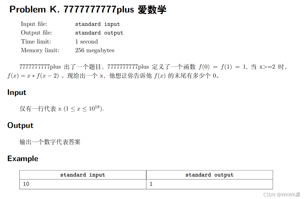 先把偶数x/2,这样变成连续的x,即求1*2*3....*x有几个末尾0,即每次答案吧加上x/5直到x变为0