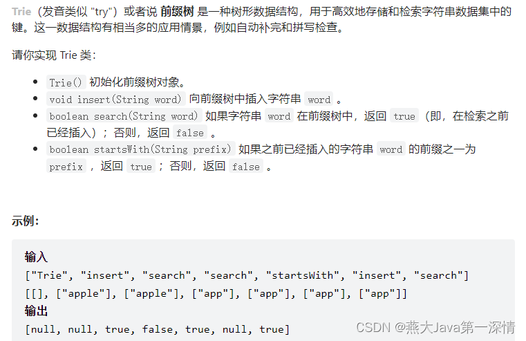由题可知,我们需要实现一种用来存储字符串的数据类型,而且根据题目中查询字符串和查询prefix我们也能想到,就是构建一层一层的树结构实现存储字符串。