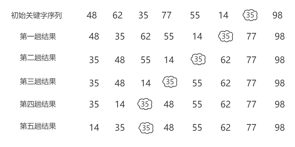 反复扫描待排序记录序列,在扫描过程中顺次比较相邻俩个元素的大小,若逆序就交换。假如待排序的序列为48,62,35,77,55,14,35,98。下面为示例图: