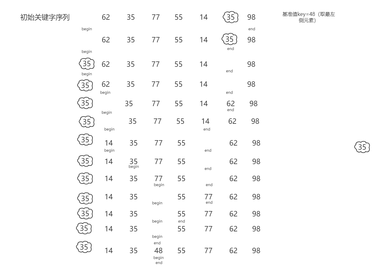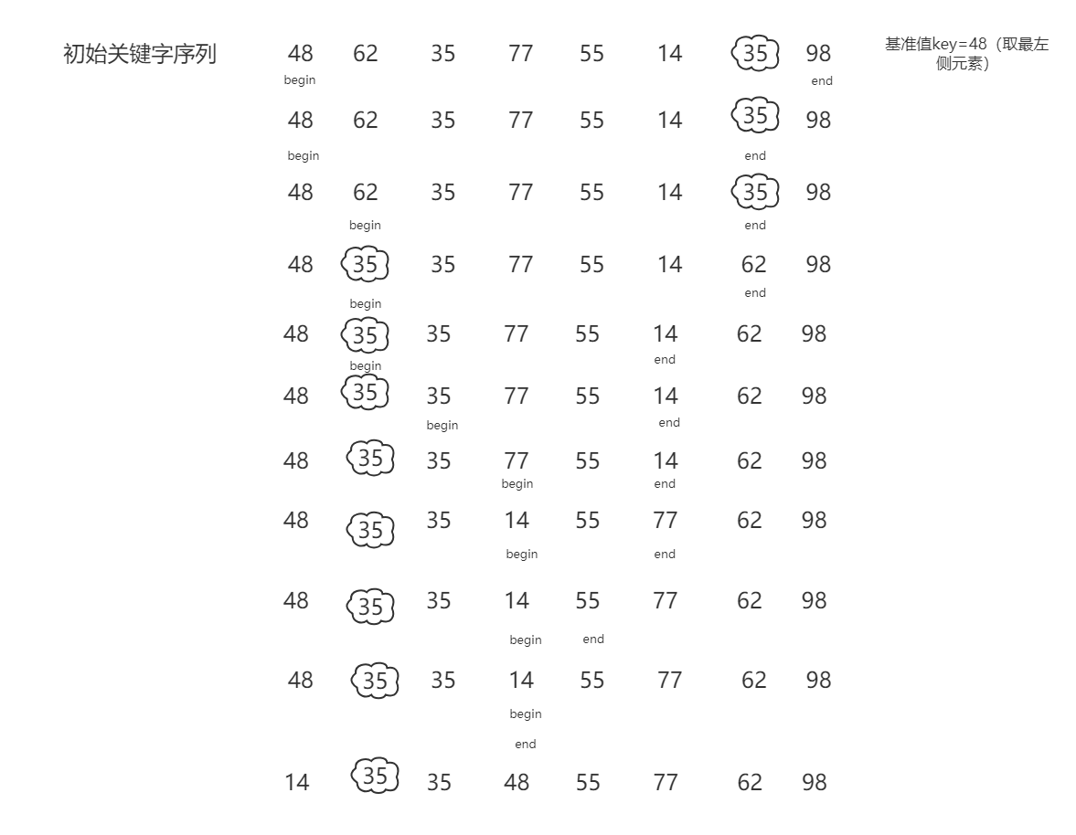 此次实例的基准值为最左侧元素48。先让指针end从后向前找比基准值小的元素,找到了就停止。再让指针begin从前向后找比基准值大的元素,找到了就停止;如果指针begin和end没有相遇,则将begin和end指向的元素进行交换。交换之后,再次重复上方法直至指针begin和end相遇,最后将基准值和指针begin/end指向的元素(指针begin和end相遇,俩个指针指向的元素是同一个)进行交换。