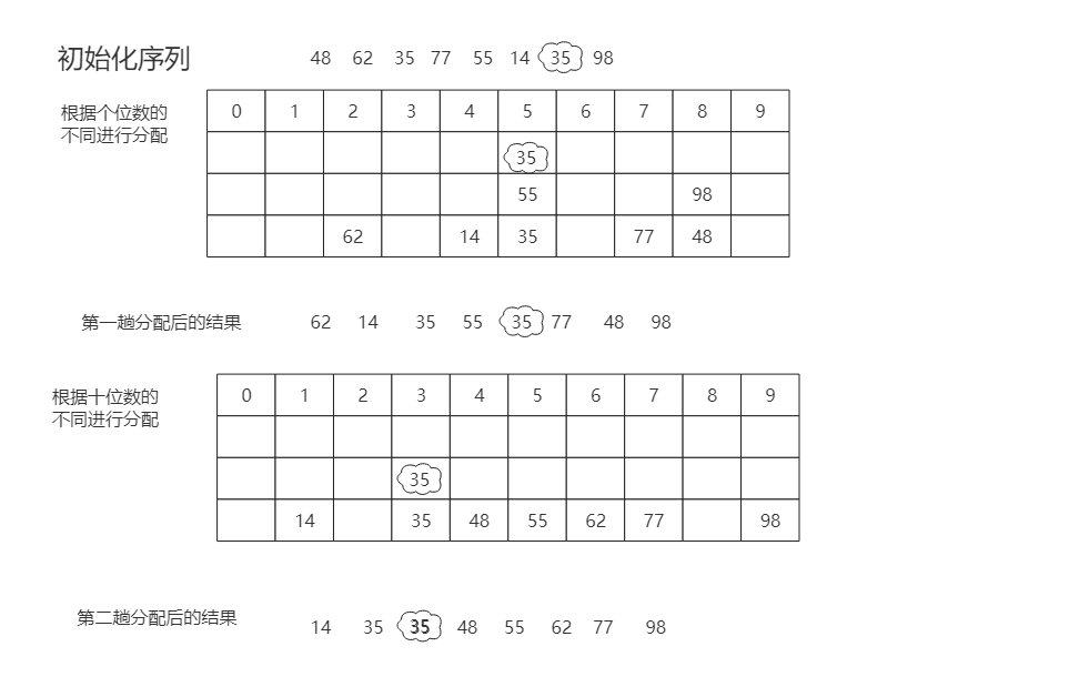 假如待排序的序列为48,62,35,77,55,14,35,98。下面为示例图: