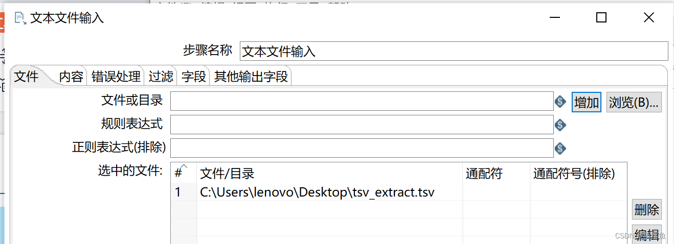 3.双击“文本文件输入”控件,进入“文本文件输入”界面,单击【浏览】按钮,选择要抽取的文件tsv_extract.tsv,单击【增加】按钮,将要抽取的TSV文件添加到转换“tsv_extract”中。
