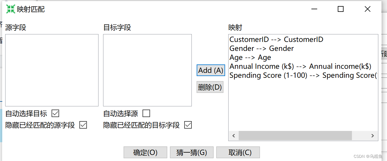 单击“数据库字段”选项卡;再单击【输入字段映射】按钮,弹出“映射匹配”对话框,将“源字段”选项框的字段和“目标字段”选项框对应的字段进行映射匹配。