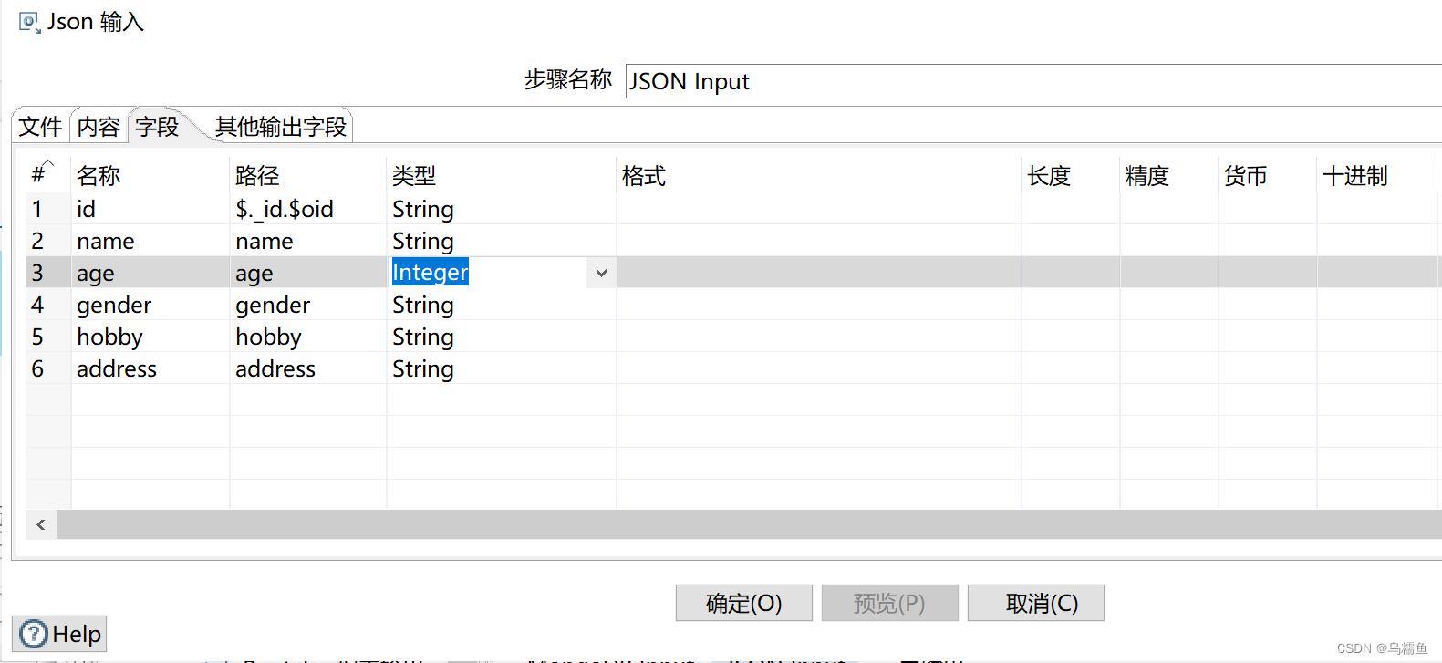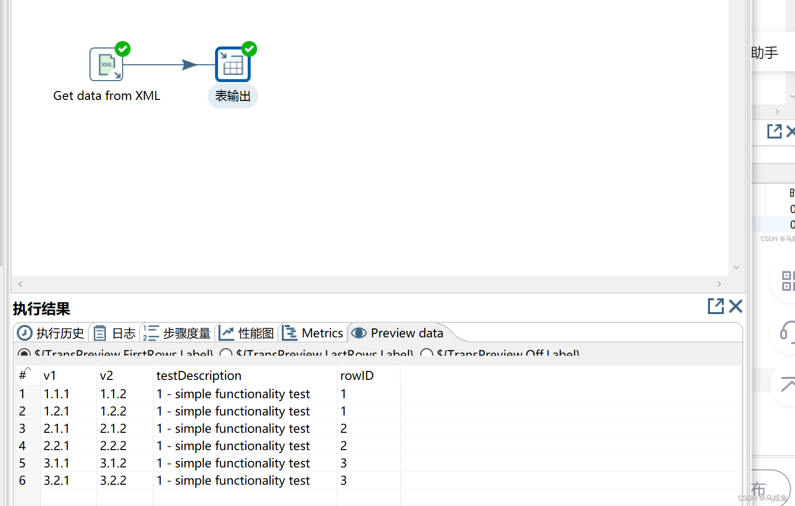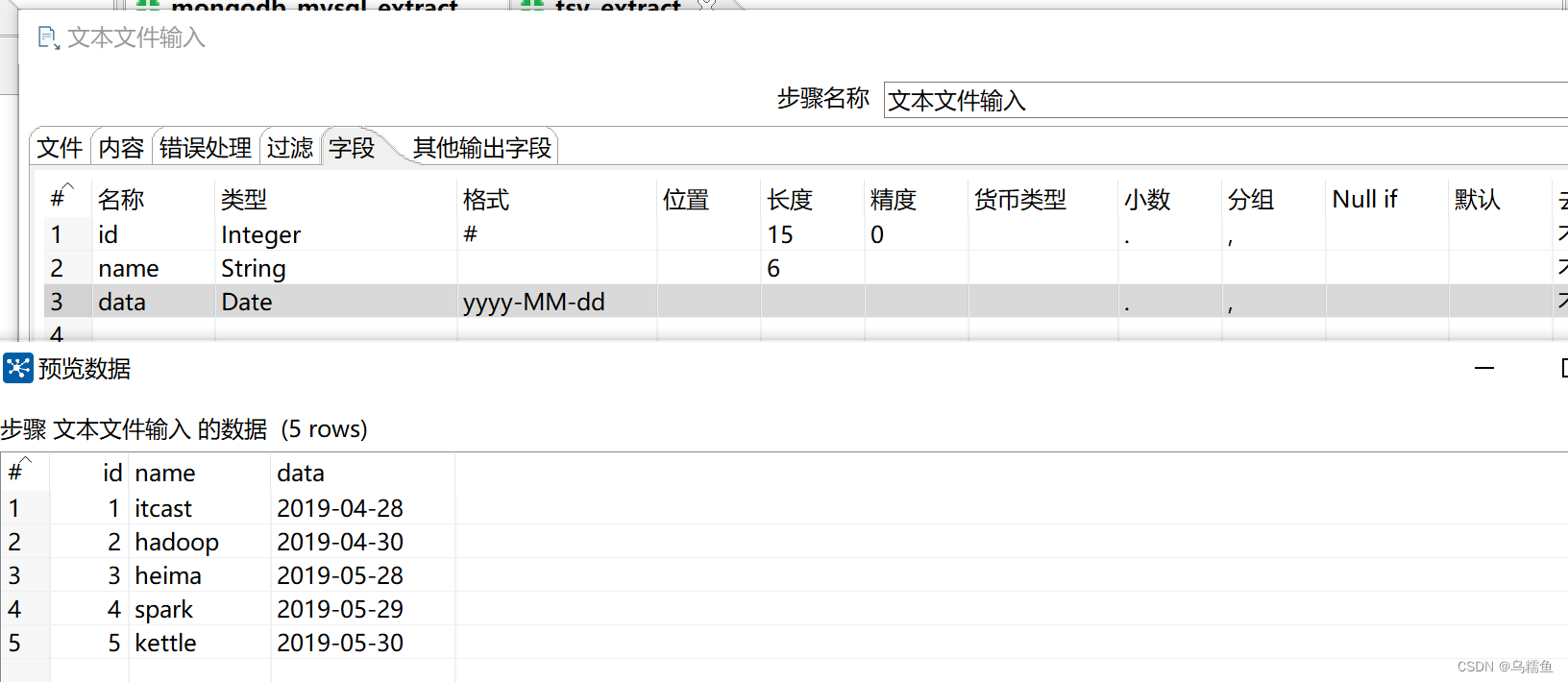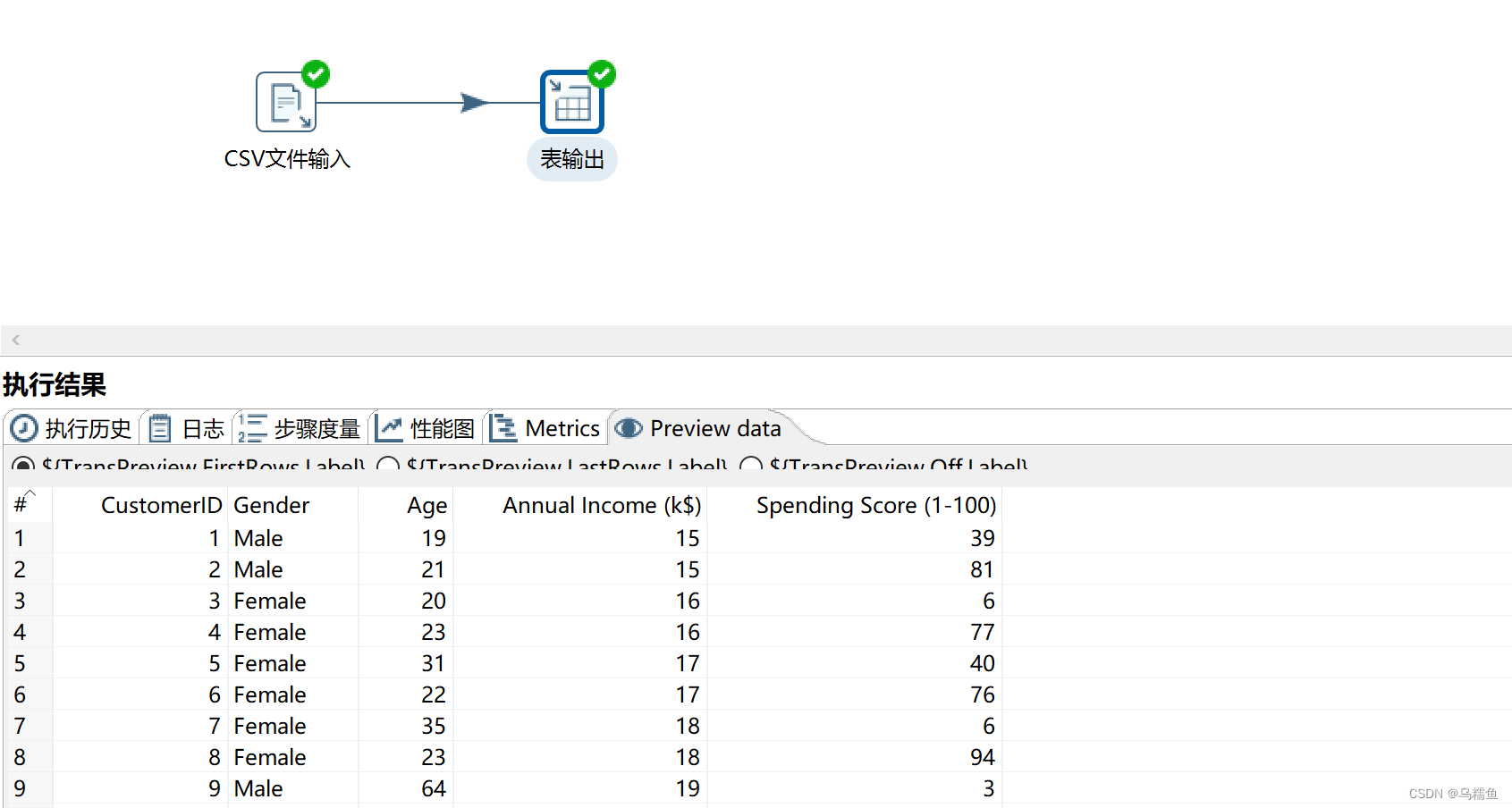 单击【预览】按钮,查看文件csv_extract.csv的数据是否抽取到CSV文件输入流中。