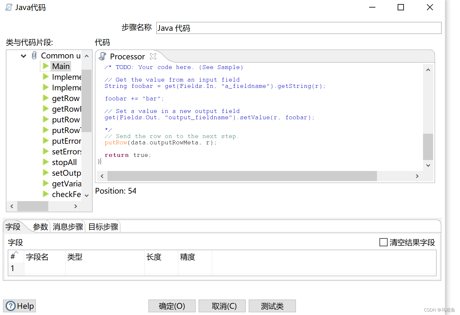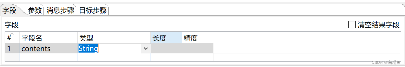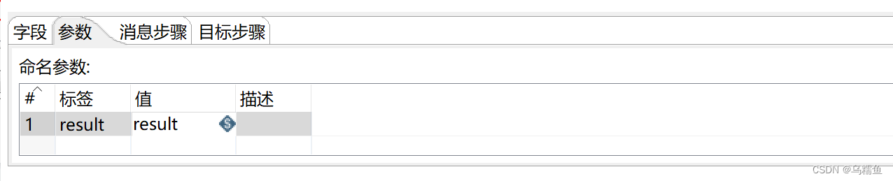 在“Java代码”控件中的代码框编写抽取HTML网页数据的Java脚本代码(具体代码请参考教材文件4-1 Processor.class)。 单击“Java代码”控件中的“字段”选项卡,用于添加新生成的字段;单击“参数”选项卡,用于传入参数。“字段”选项卡界面和“参数”选项卡界面具体如图所示。