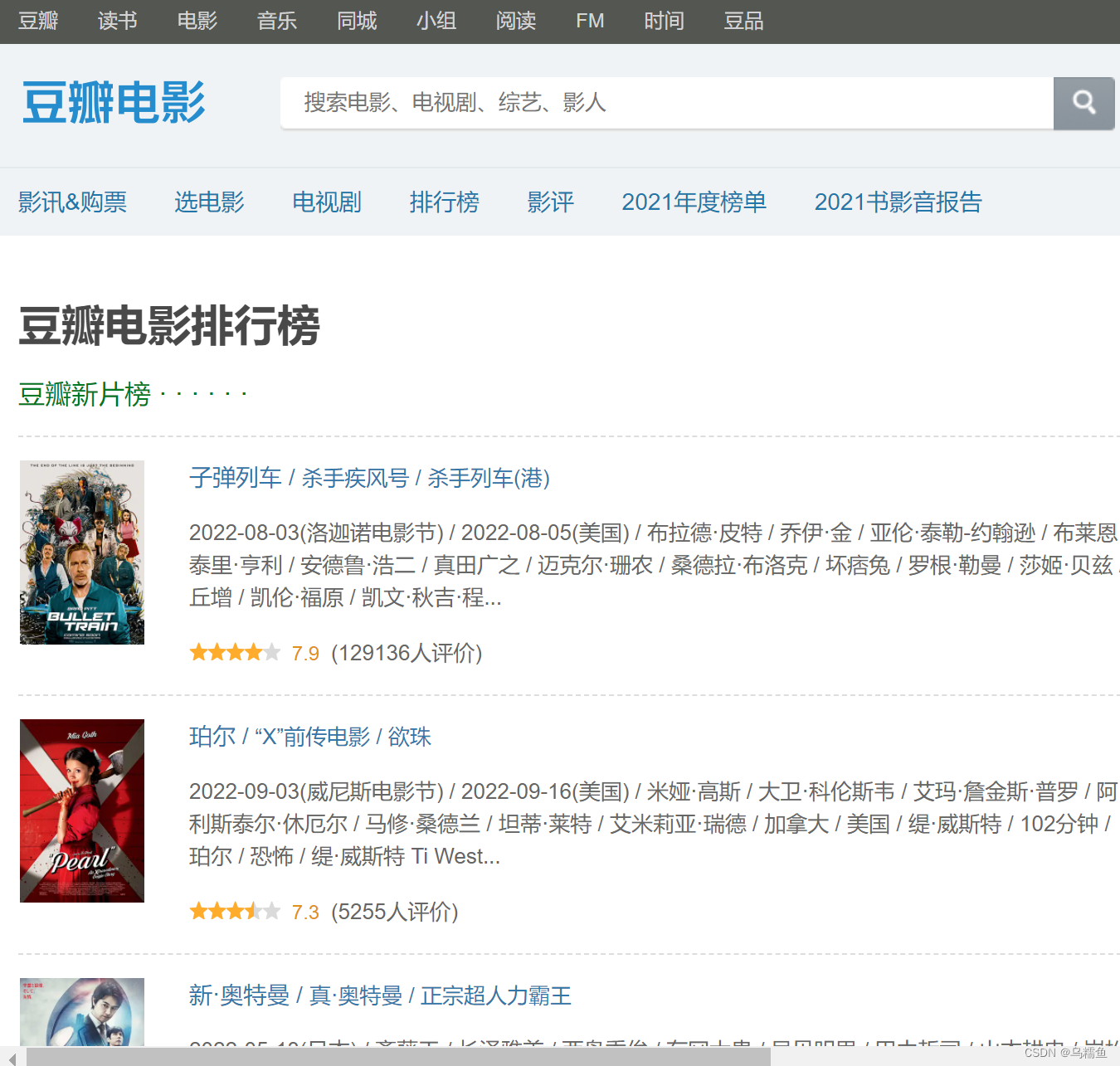 1.数据准备:我们以抽取“豆瓣电影排行榜”网页的超链接数据为例进行抽取数据,豆瓣电影排行榜页面的部分内容如图所示。