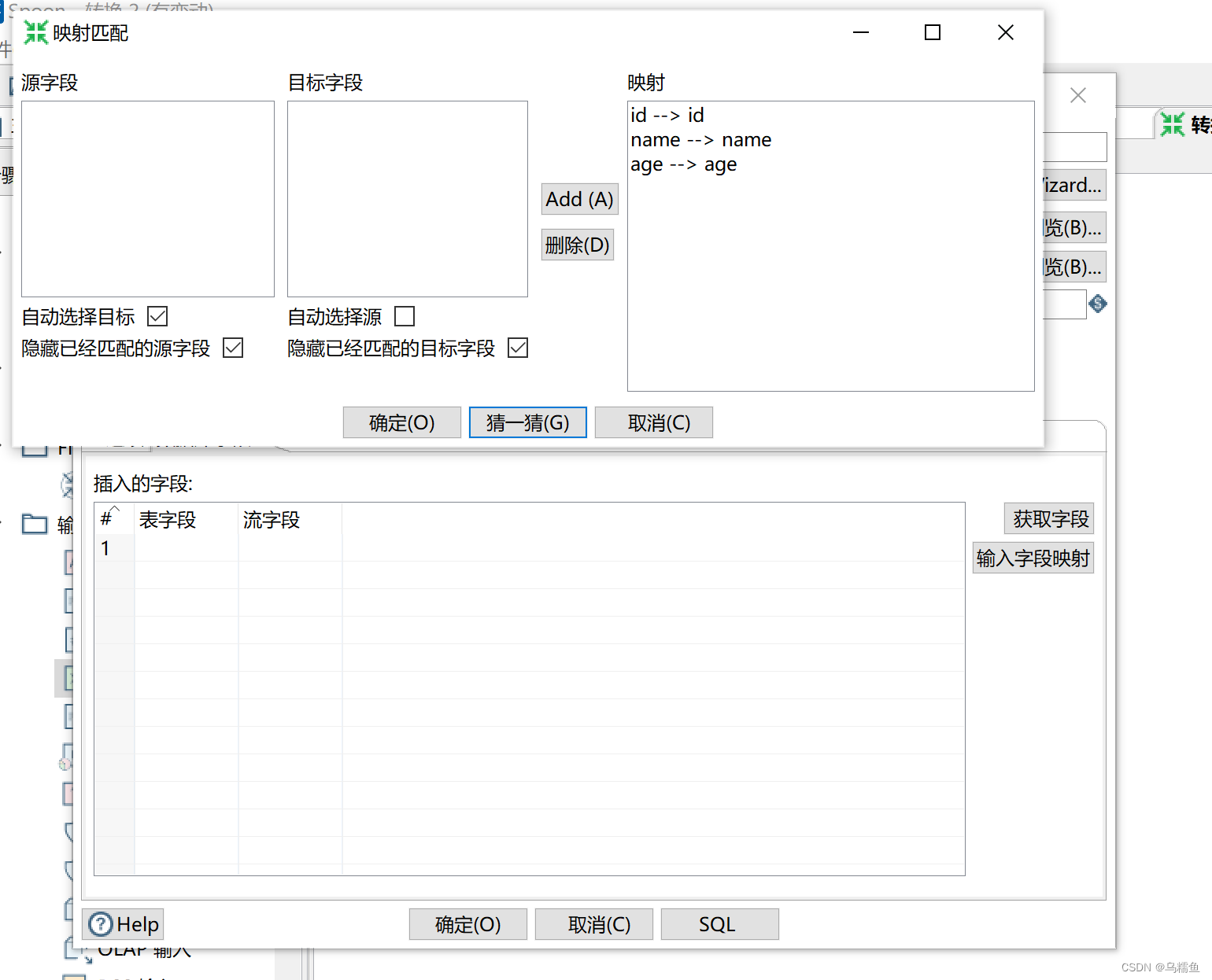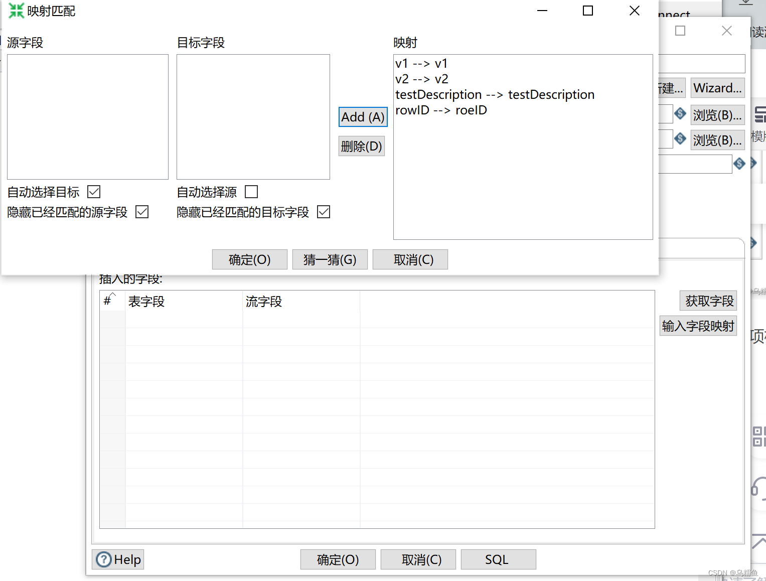 单击“数据库字段”选项卡,再单击【输入字段映射】按钮,弹出“映射匹配”对话框,将“源字段”选项框的字段和“目标字段”选项框对应的字段进行映射匹配。“表输出”控件配置的最终效果,具体如图所示。