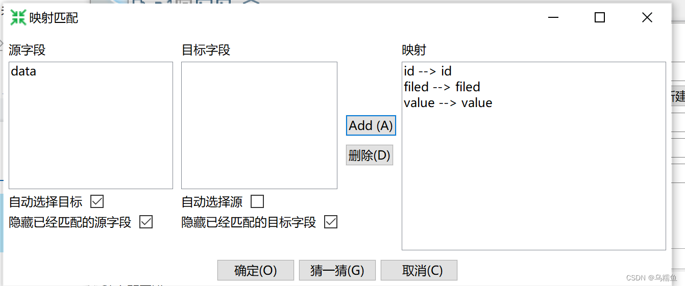 单击“字段”选项卡,添加要抽取的数据字段(这里采用分层抽取数据字段,先抽取id和data字段,再从data字段中抽取field和value字段)。