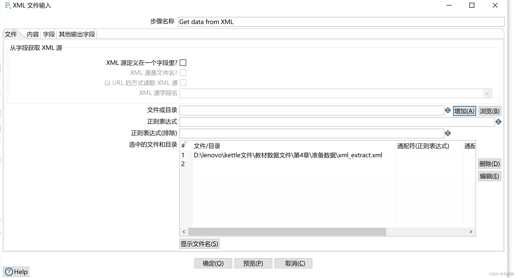 双击“Get data from XML”控件,进入“XML文件输入”界面,单击【浏览】按钮,选择要抽取的XML文件xml_extract.xml