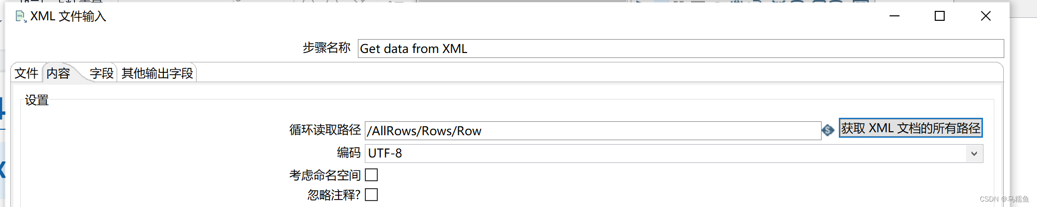 单击“内容”选项卡,单击【获取XML文档的所有路径】选择循环读取路径,即/AllRows/Rows/Row。