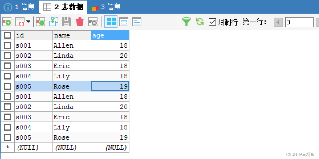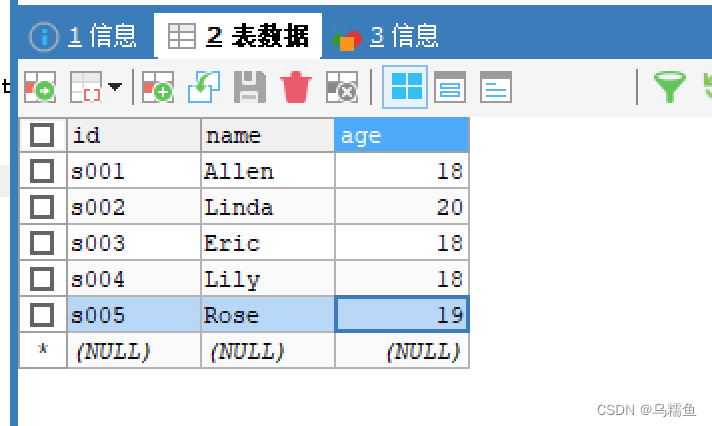 5.通过SQLyog工具,查看数据表student是否已成功插入10条数据,具体如图所示。