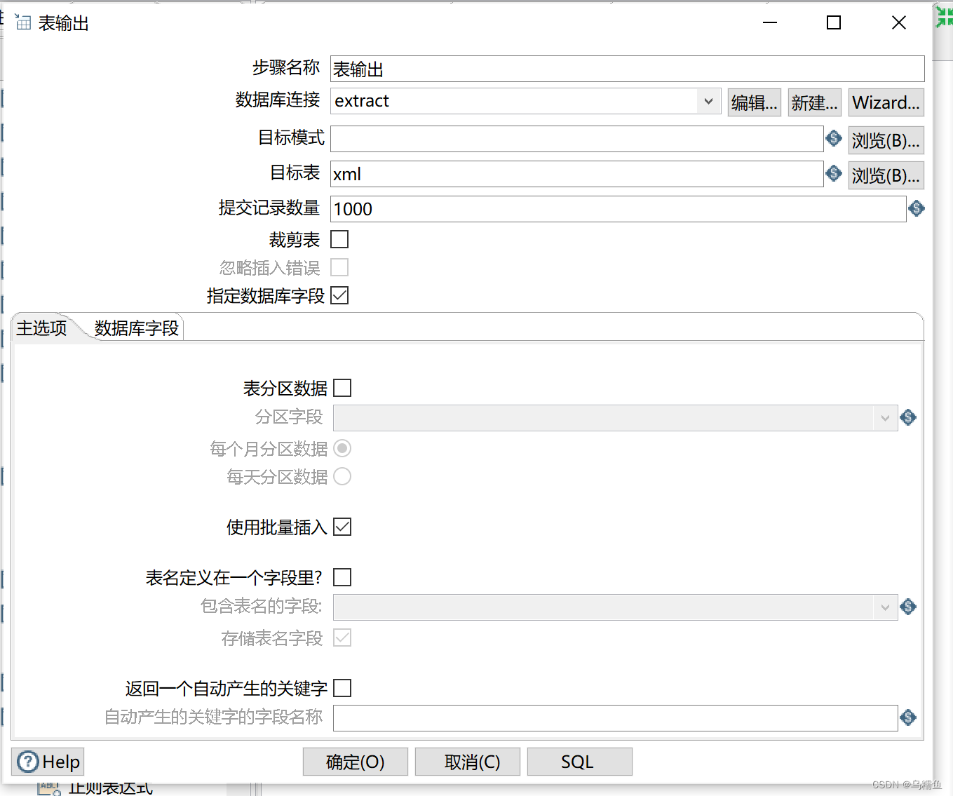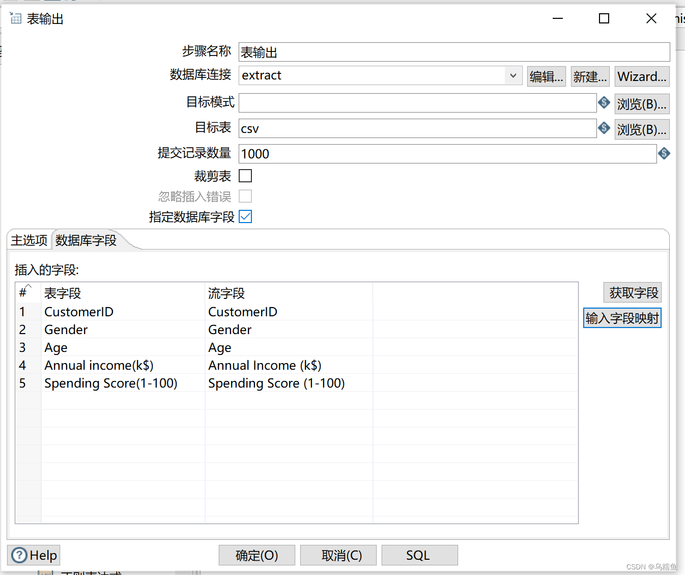 2. 双击“表输出”控件,进入“表输出”控件的配置界面,单击【新建】按钮,配置数据库连接,配置完成后单击【确认】按钮,单击目标表右侧的【浏览】按钮,获取目标表,即数据表csv;勾选“指定数据库字段”的复选框。