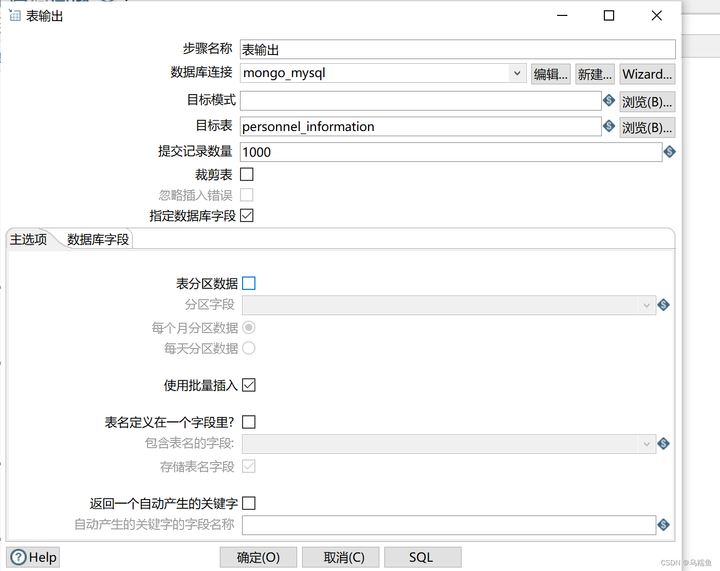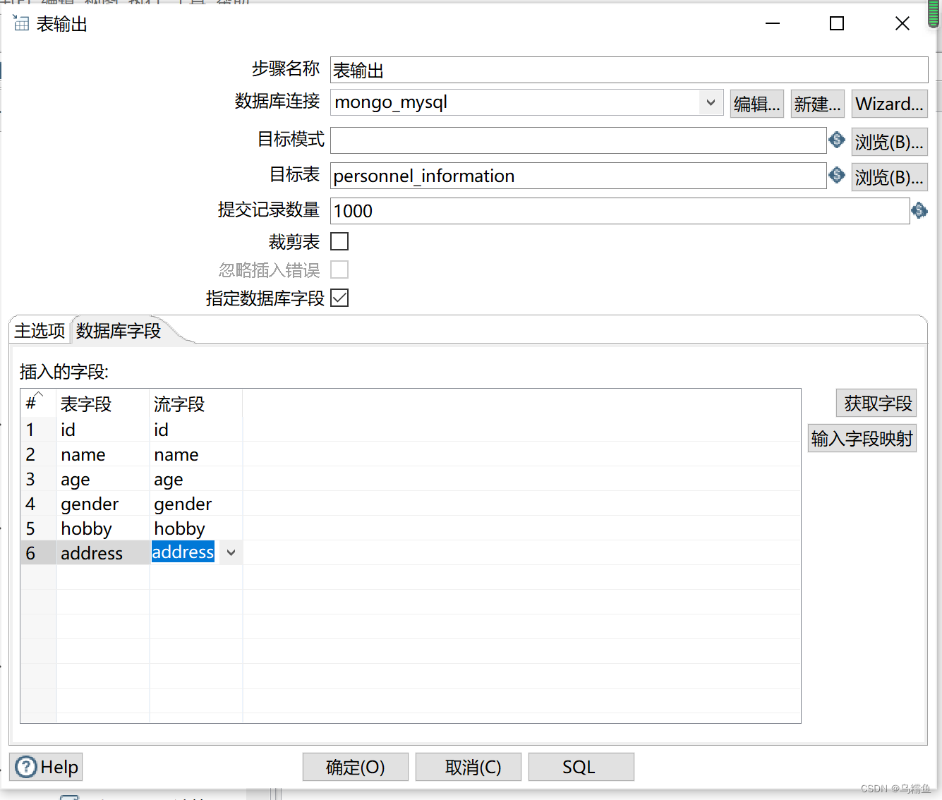 4.双击“表输出”控件,进入“表输出”配置界面。单击【新建】按钮,配置数据库连接,配置完成后单击【确认】按钮。单击目标表右侧的【浏览】按钮,选择输出的目标表,即数据表personal information;勾选“指定数据库字段”的复选框,用于将MySQL中数据表Personal information的字段与MongoDB中集合Personal information中的字段进行匹配。