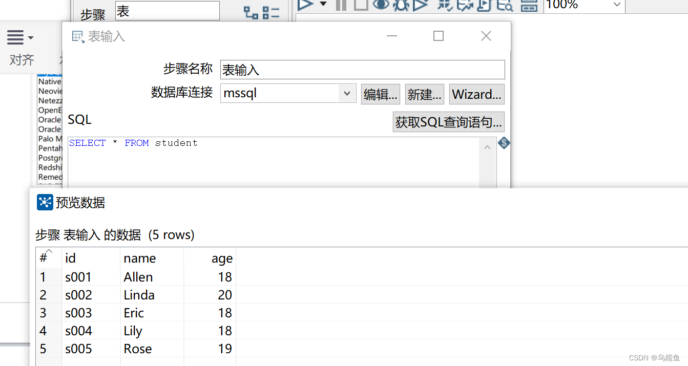 在SQL框中编写查询数据表student的SQL语句,然后单击【预览】按钮,查看数据表student的数据是否成功从SQL Server数据库中抽取到表输入流中。