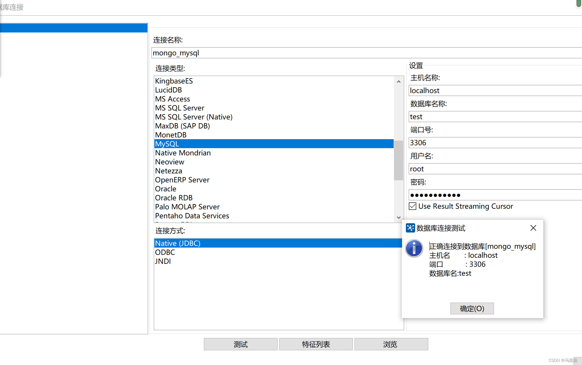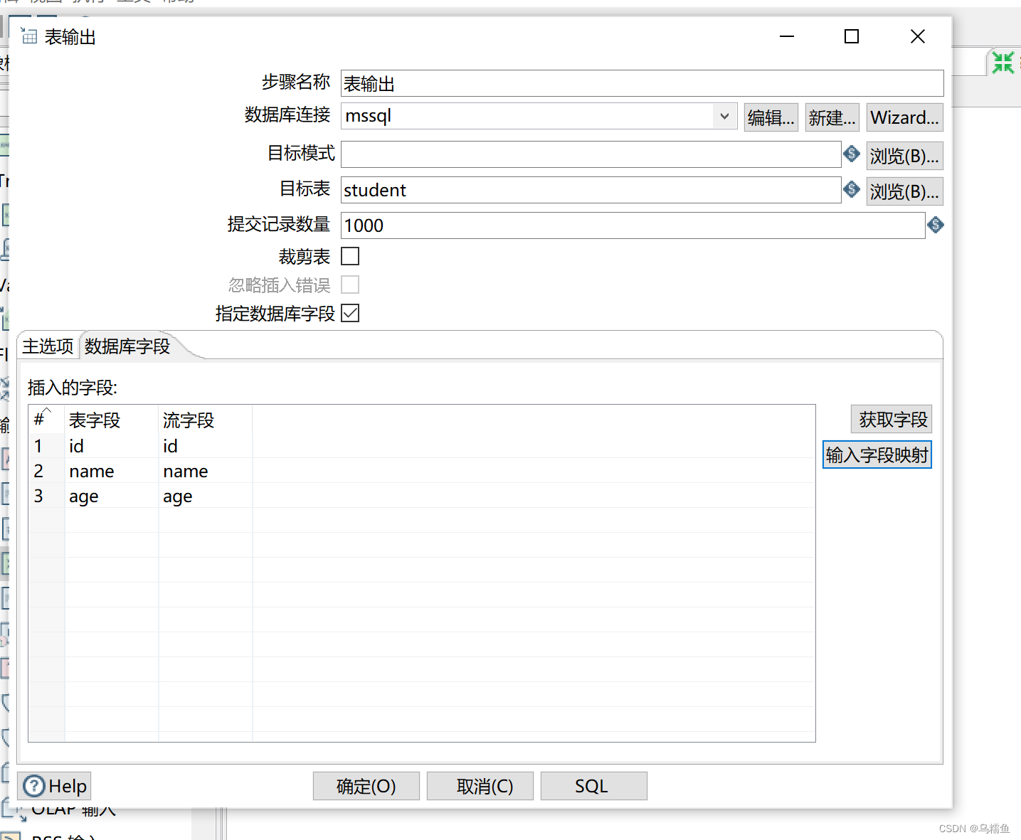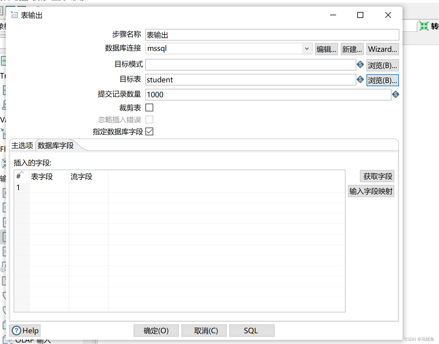 3.双击“表输出”控件,进入“表输出”配置界面。单击【新建】按钮,配置数据库连接,配置完成后单击【确认】按钮。单击【浏览】按钮,选择输出的目标表,即数据表student;勾选“指定数据库字段”的复选框,用于将数据表student的字段与数据表student_mysql的字段进行匹配。