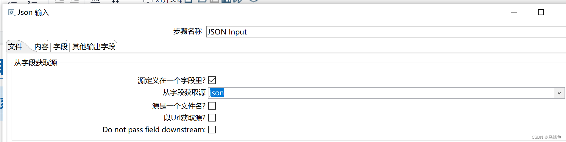 3.双击“JSON input”控件,进入“JSON input”配置界面。单击“文件”选项卡,配置数据的获取源,勾选“源定义在一个字段里?”的复选框,在“从字段获取源”的下拉框中选择从json字段获取数据。