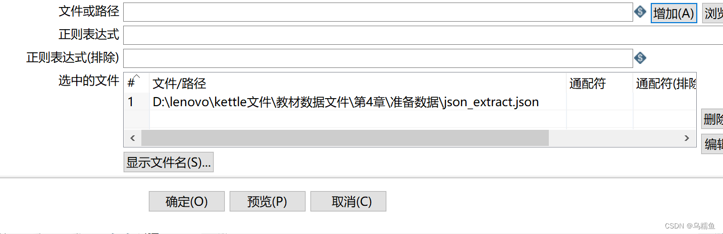 2.双击“JSON input”控件,进入“JSON输入”界面,单击【浏览】按钮,选择要抽取的JSON文件json_extract.json;单击【增加】按钮,将所选择的文件添加到“选中的文件和目录”处