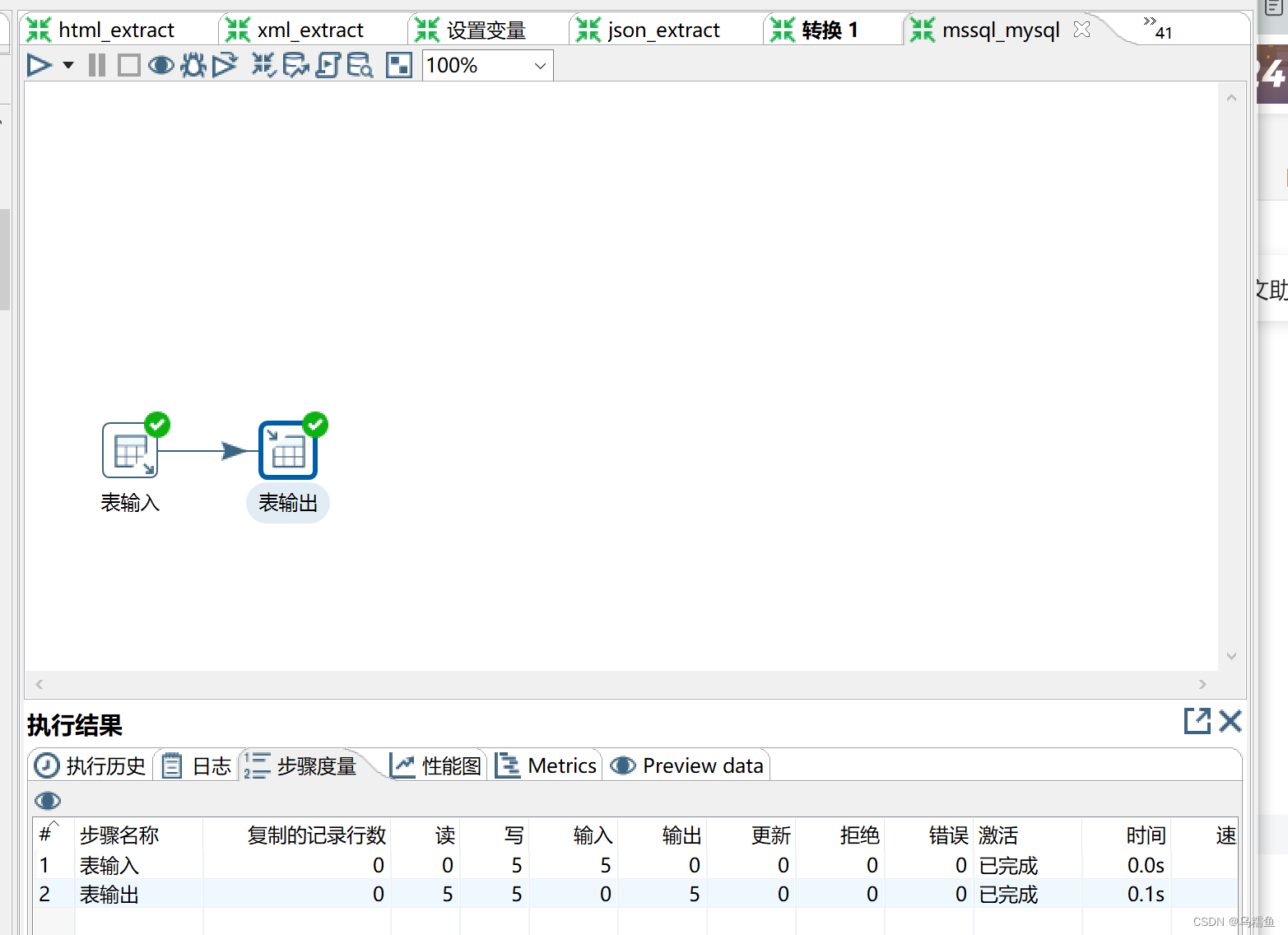 通过使用Kettle工具,创建一个转换csv_extract,并添加“CSV文件输入”控件、“表输出”控件以及Hop跳连接线,具体如图所示。