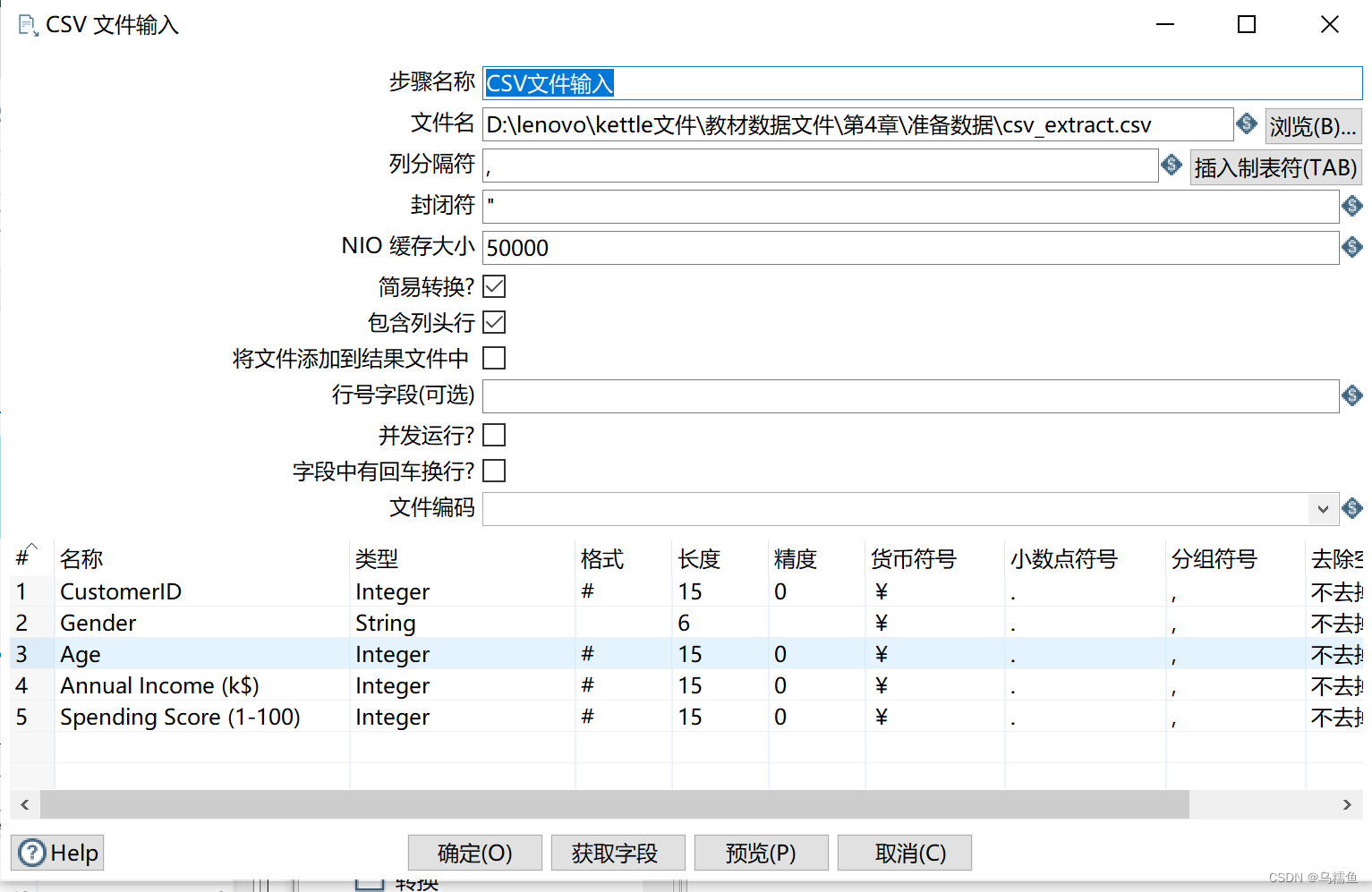 2.双击“CSV文件输入”控件,进入“CSV文件输入”界面, 单击【浏览】按钮,选择要抽取的文件csv_extract.csv,单击【获取字段】按钮,Kettle自动检索CSV文件,并对文件中的字段类型、格式、长度、精度等属性进行分析。