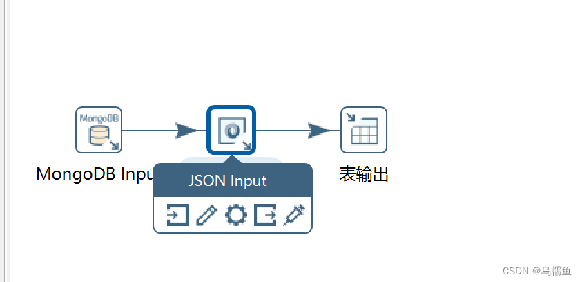 通过使用Kettle工具,创建一个转换mongodb_mysql_extract,并添加“MongoDB input”控件、“JSON input”控件、“表输出”控件以及Hop跳连接线,具体如图所示。