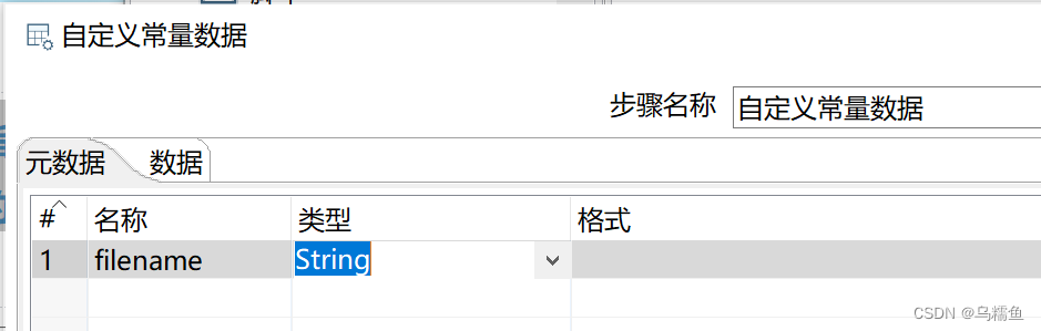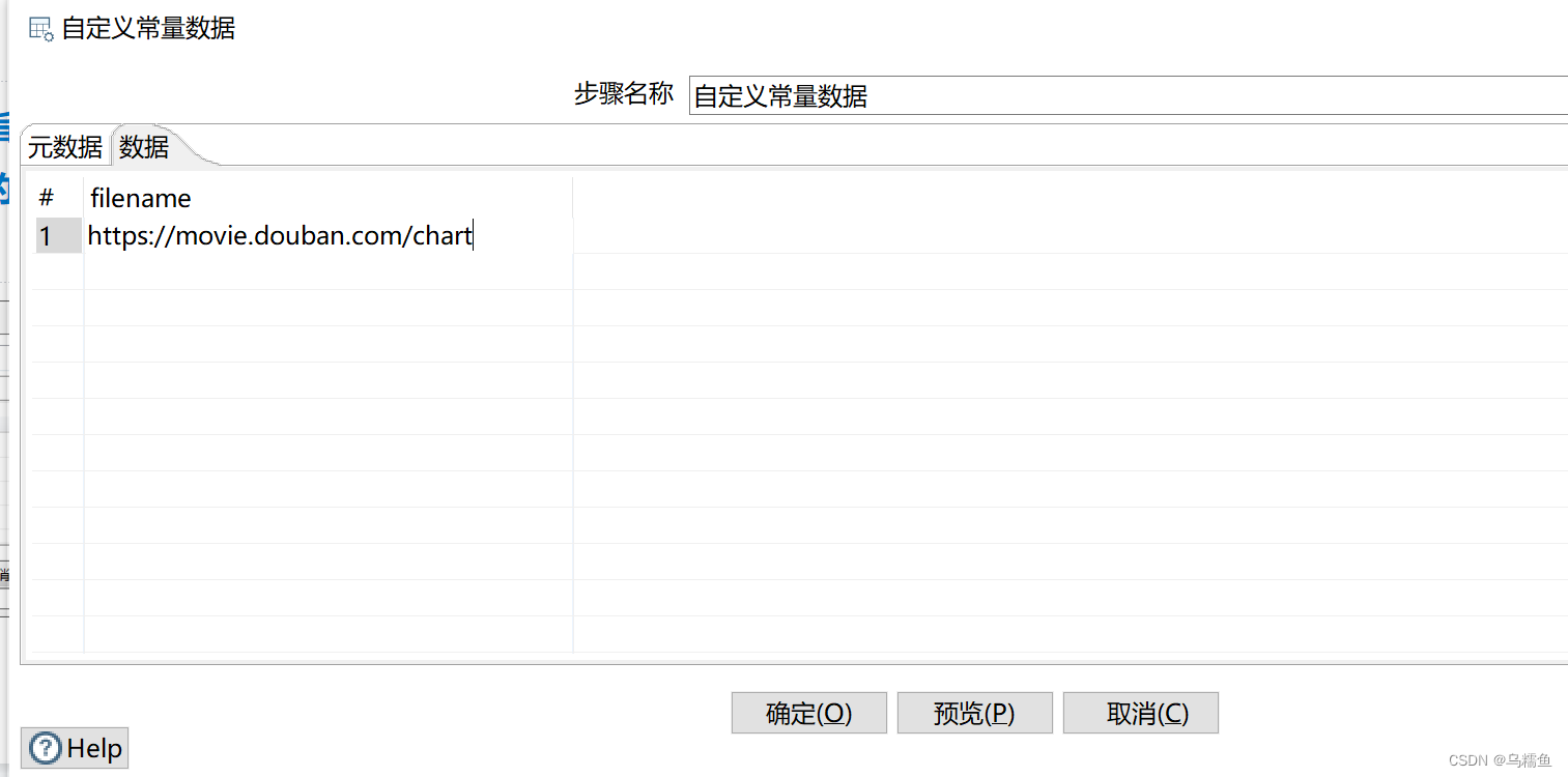 双击“自定义常量数据”控件,进入“自定义常量数据”界面,单击“元数据”选项卡,定义一个字段常量filename并指定数据类型String;单击“数据”选项卡,添加html形式数据所在的URL,即