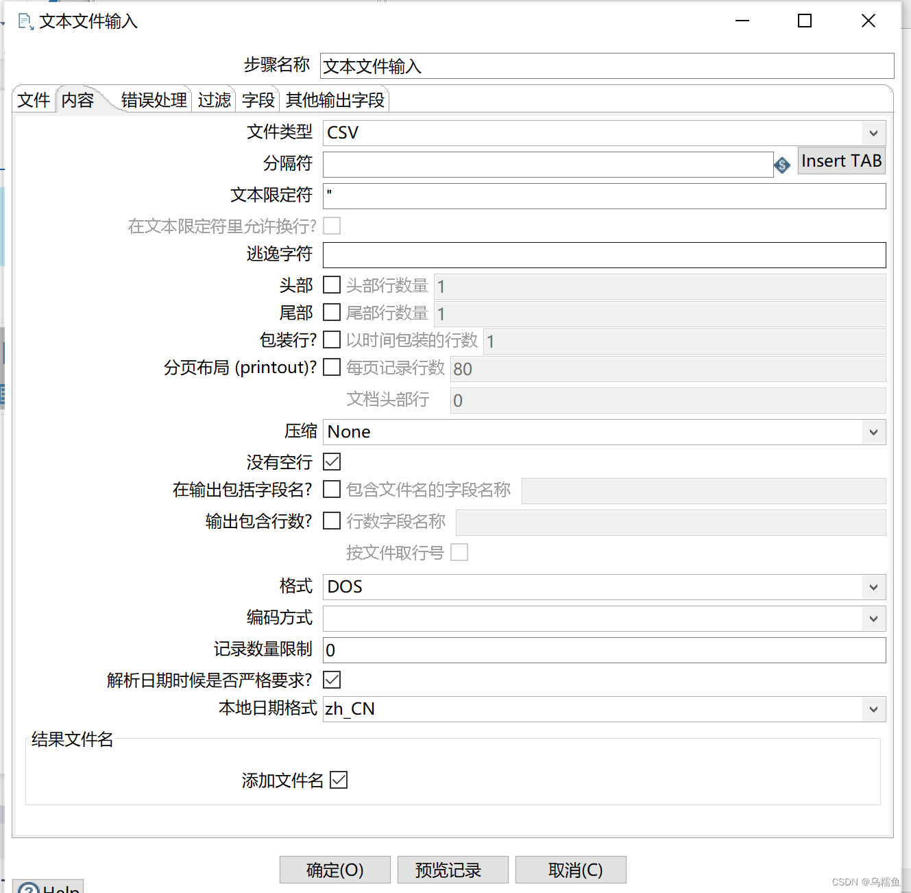 单击“内容”选项卡,清除分隔符处默认分隔符“;”并单击【Insert TAB】按钮,在分隔符处插入一个制表符;取消勾选“头部”复选框。