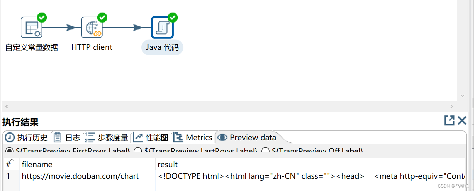 通过使用Kettle工具,创建一个转换转换html_extract,并添加“自定义常量数据”输入控件、“HTTP client”查询控件和“Java代码”脚本控件,,具体如图所示。