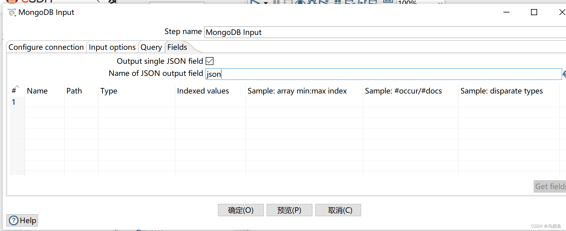 单击“Fields”选项卡,勾选“Output single JSON field”的复选框,并在“Name of JSON output field”处指定输出的字段名为json。