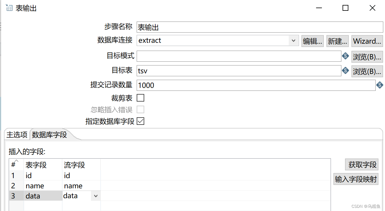 4.双击“表输出”控件,进入“表输出”控件的配置界面,单击【新建】按钮,配置数据库连接,配置完成后单击【确认】按钮,单击目标表右侧的【浏览】按钮,获取目标表,即数据表tsv,勾选图4-13中的“指定数据库字段”复选框。