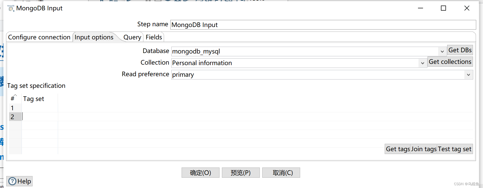 2.双击“MongoDB input”控件,进入“MongoDB input”配置界面。单击“Input options”选项卡,指定数据库和数据表,即在“Database”处添加数据库mongodb_mysql,在“Collection”处添加集合Personal information。