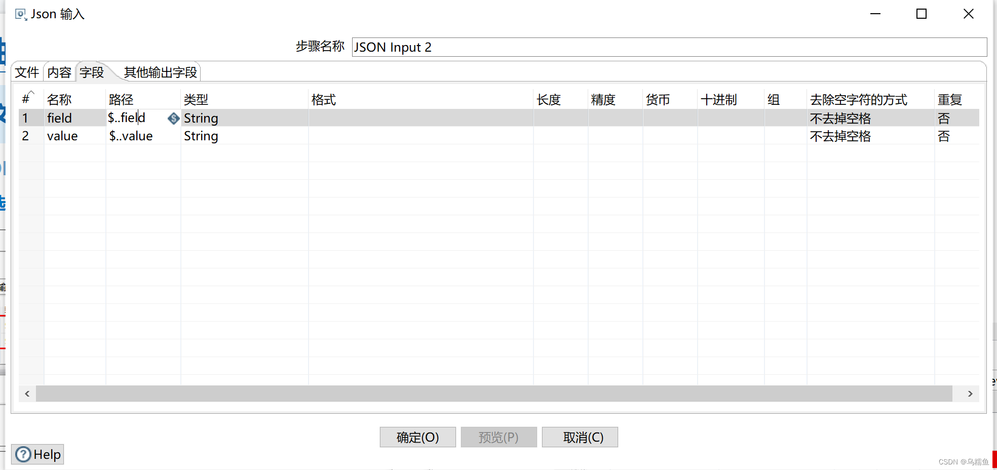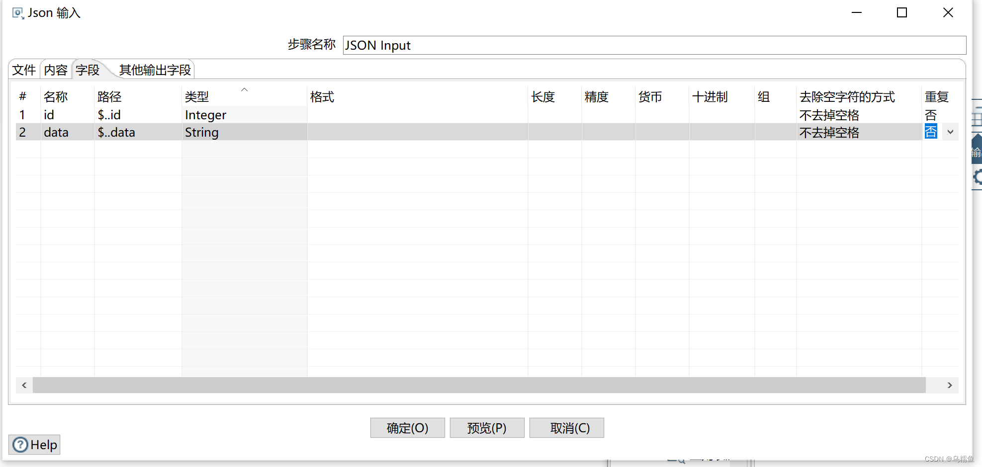 3.双击“JSON input 2”控件,进入“JSON输入”界面,勾选“源定义在一个字段里?”的复选框;在“从字段获取源”处的下拉框中选择字段名,即data,勾选“源定义在一个字段里?”的复选框;