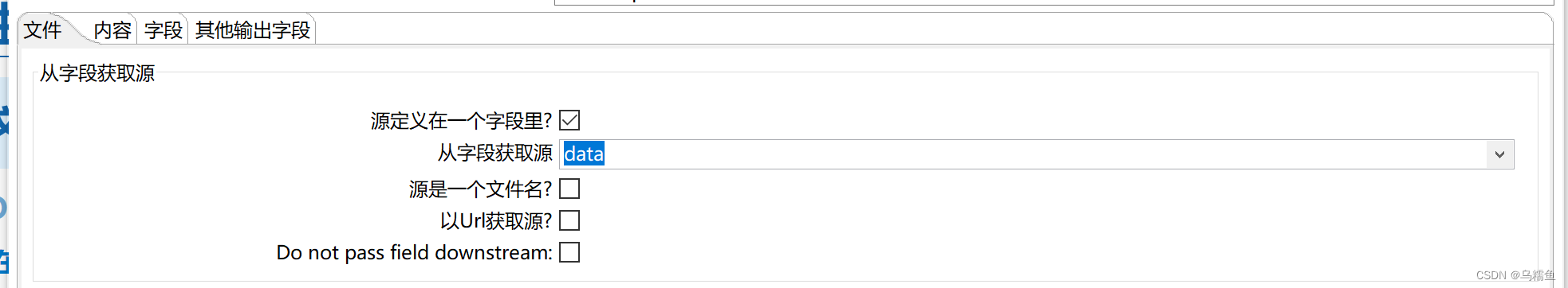 在“从字段获取源”处的下拉框中选择字段名,即data,单击“字段”选项卡;添加从字段data中抽取的field和value字段。