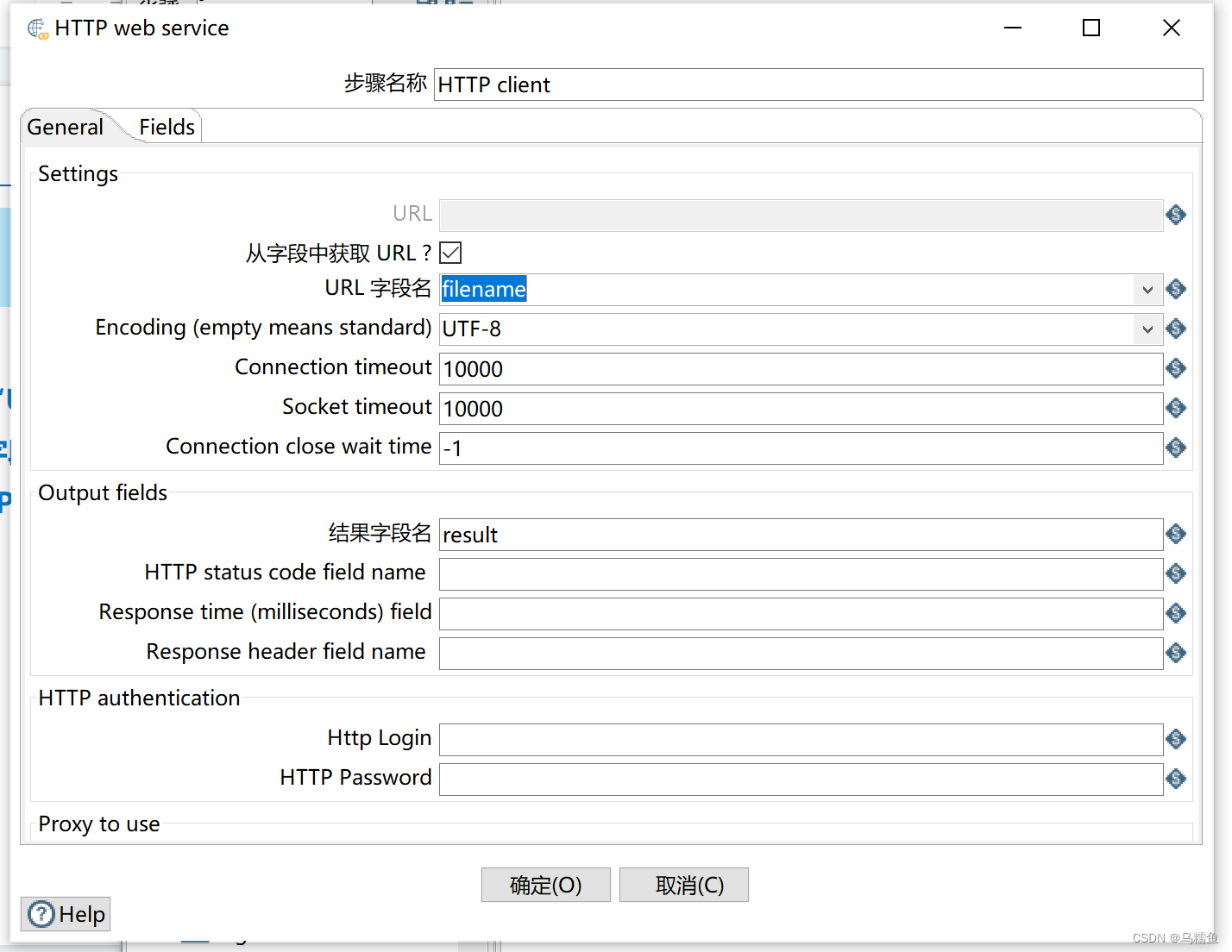 2. 双击“HTTP client”控件,进入“HTTP web service”界面,勾选图4-40的“从字段中获取URL?”的复选框;在“URL字段名”处的下拉框中选择URL字段名,即filename;在“结果字段名”处指定结果字段名称,这里选择默认的结果字段result。“HTTP client”控件配置的效果如图所示。