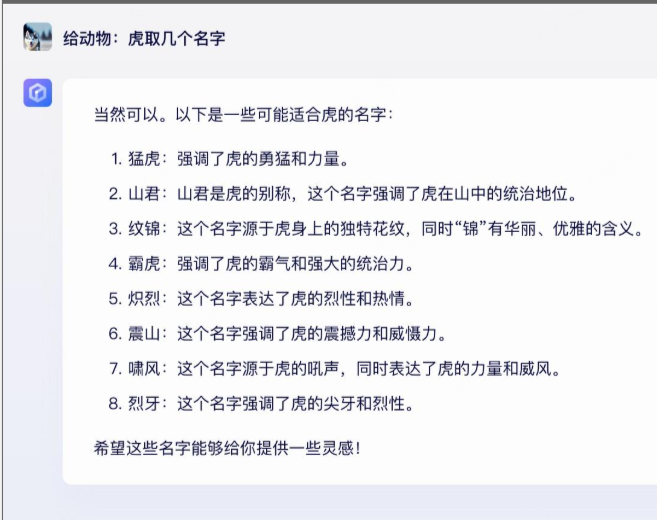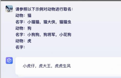 可以看到,在示例 1 中,对于起名字,在不提供示例的场景中,大模型给出的名字通常比较常规化,而在我们提供示例的场景中,大模型能够了解我们的取名倾向,并给出和示例风格一致的名字。
