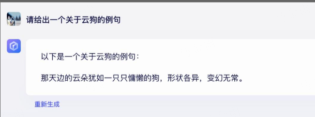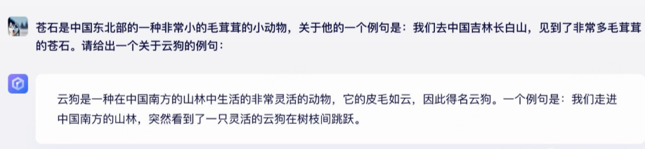 在示例 2 中,在不提供额外信息的情况下,大模型无法理解「云狗」这个概念,提供的回答比较常规化,只是一种可能的比较合理的解释。在提供了「苍石」这个信息和示例之后,大模型可以类比理解「云狗」是一种动物,并且给出和示例相近的介绍和例句。