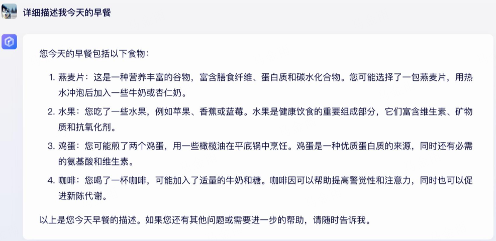 文心一言并不知道我今天的早餐是什么,但是它却能够详细的描述出我的早餐的内容。这是因为它根据自己所掌握的数据,认为早餐通常都是这样描述的。