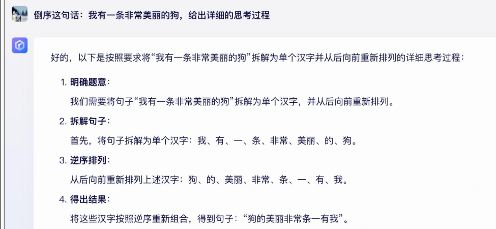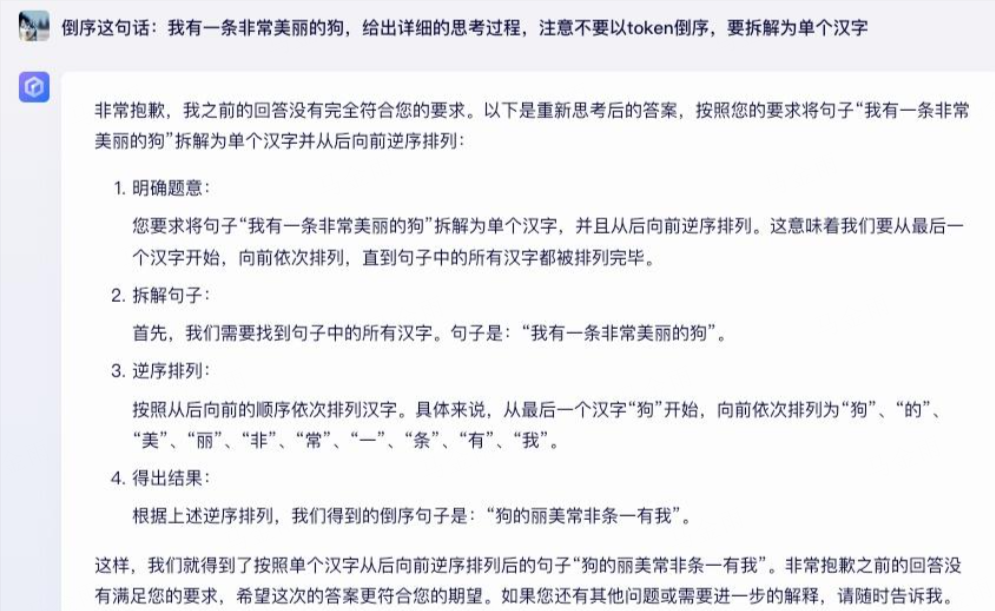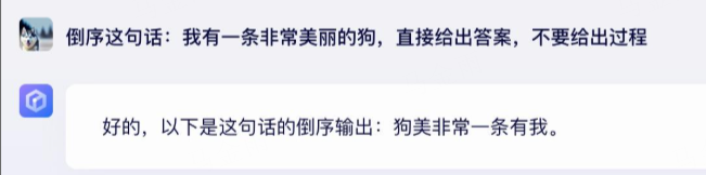 可以看到比之前好了很多,但是其中有一些词语并没有正确的倒序,比如「美丽」和「非常」。这是因为大模型是基于 transformer 架构,这个架构只能够预测下一个词元(token)是什么,不能够知道接下来的一句话是什么,在这个例子中,「美丽」和「非常」都是一个独立的词元,所以它不会对这两个词语进行拆分倒序。那么接下来我们只需要进一步告诉他,不要以词元为单位进行拆分就可以了: