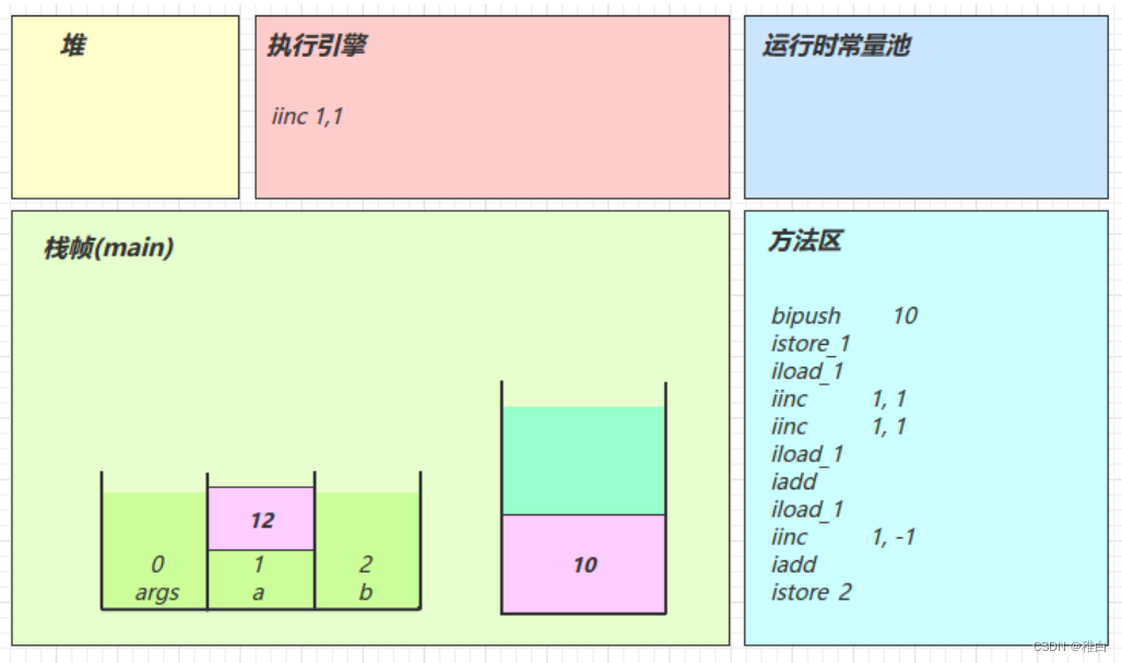 2.每个栈由多个栈帧(Frame)组成,对应每次方法调用时所占用的内存