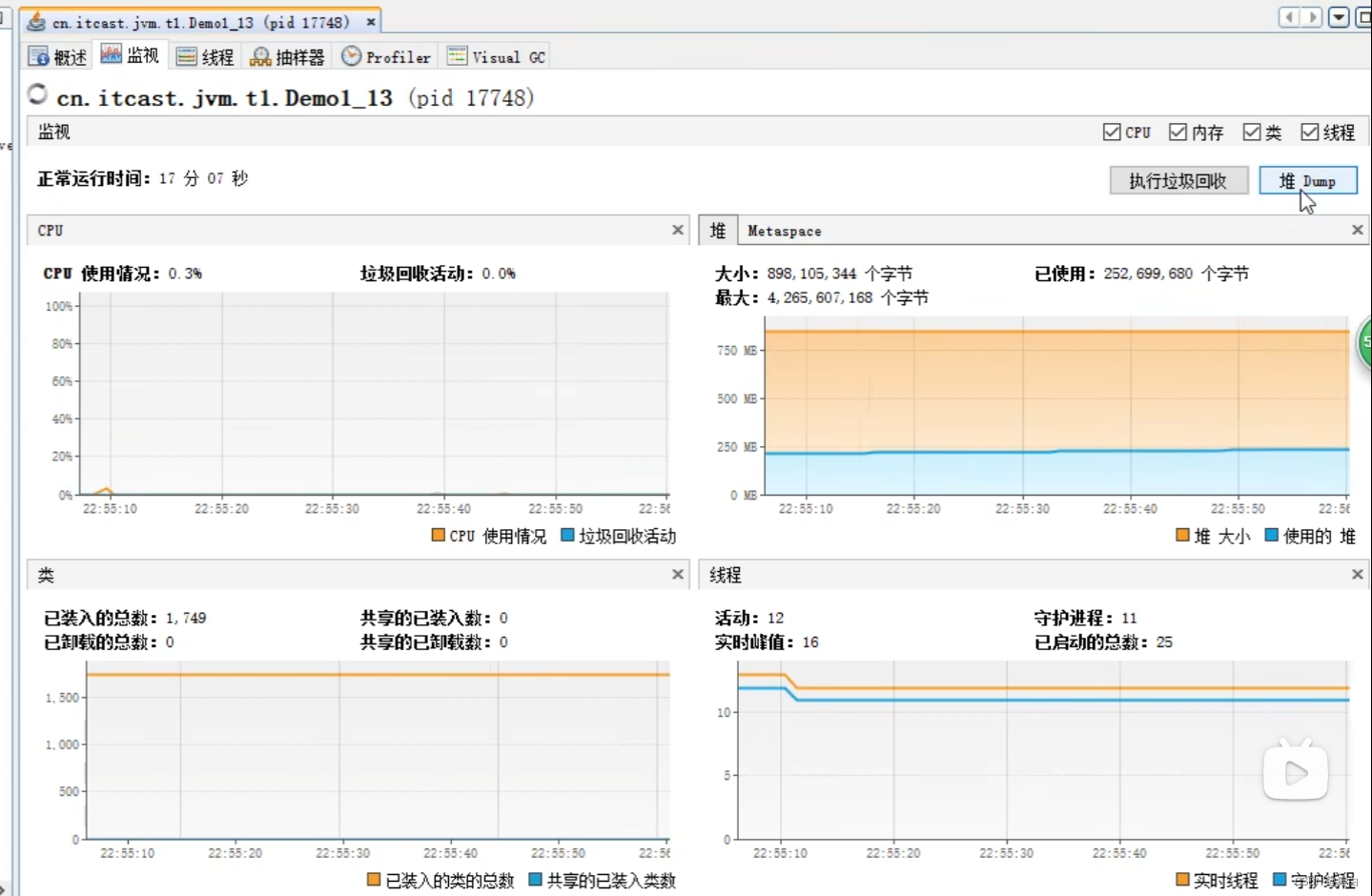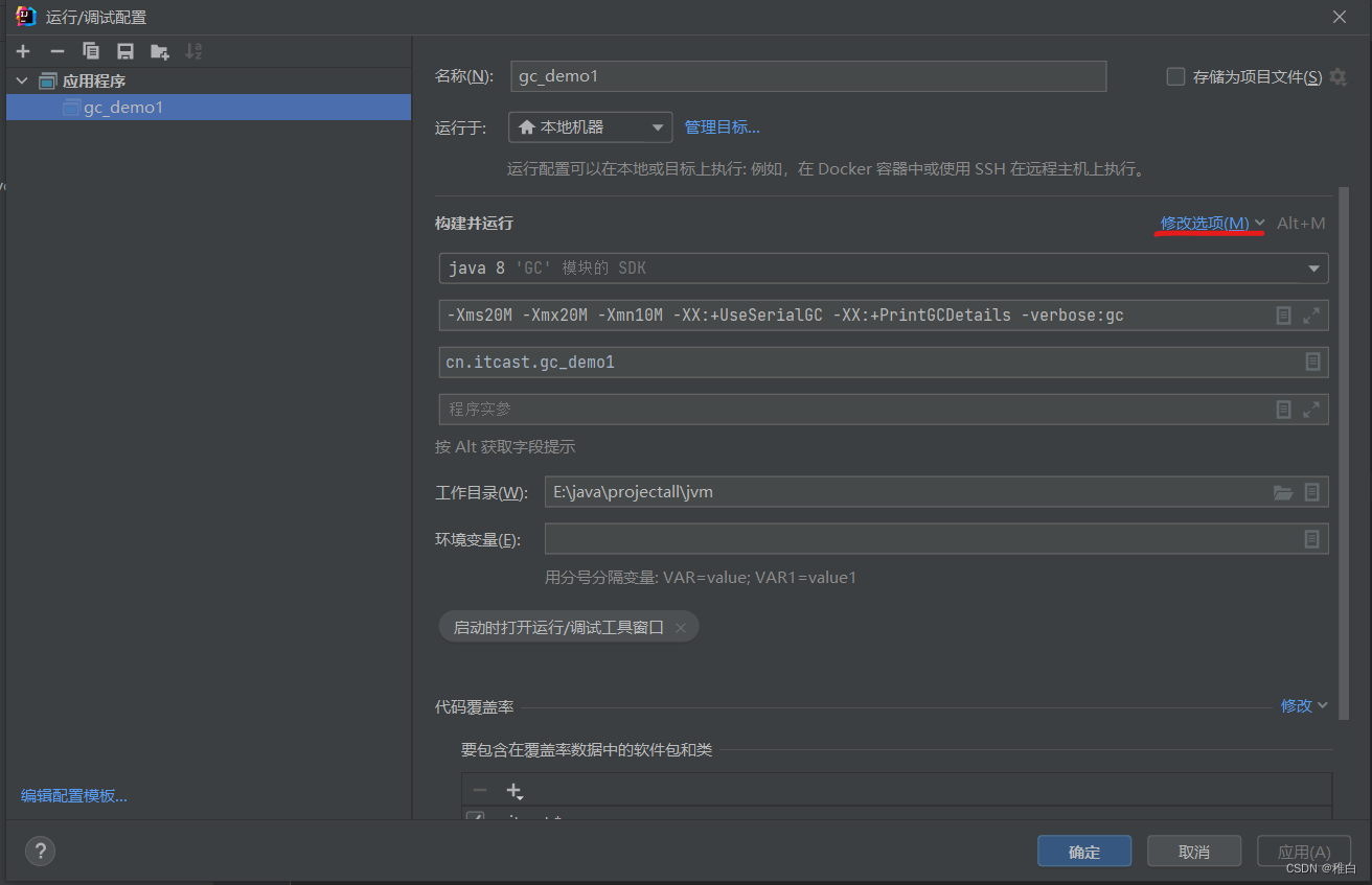 在添加运行时参数 -XX:- UseGCOverheadLimit 之后,即停用该操作。这一次的报错位置便成了Java heap space,即堆内存溢出